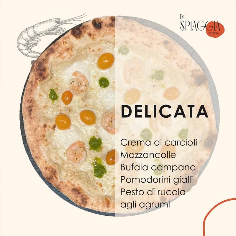 crema di carciofi, mozzarella, bufala campana, mazzancolle*, pomodorino giallo, pesto di rucola agli agrumi
