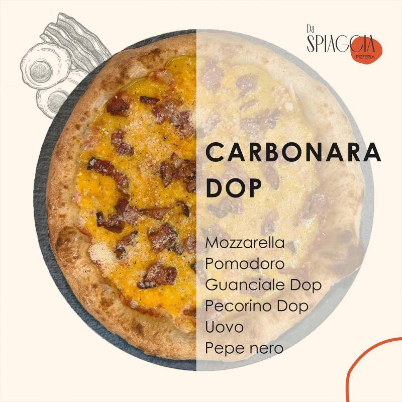 pomodoro, mozzarella, guanciale croccante, uovo, pecorino, pepe nero