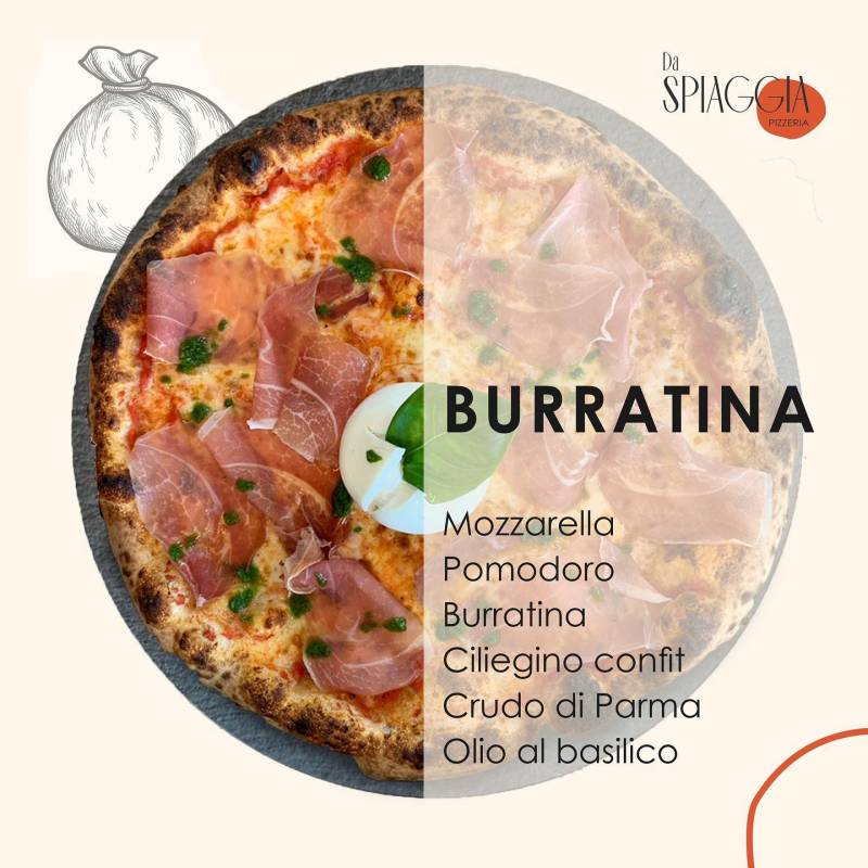 pomodoro, mozzarella, crudo di parma 24 mesi, burrata, pomodorino confit